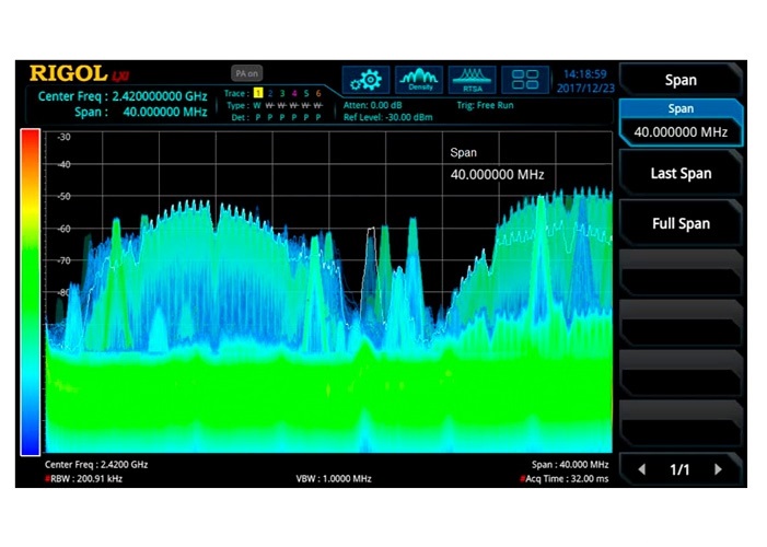 Опция RSA3000-B40 позволяет увеличить полосу анализа у анализаторов спектра Rigol серии RSA3000 (RSA3030 и RSA3045) в режиме RTSA до 40 МГц. Минимальная длительность для гарантированного захвата сигналов 100% POI - 7,45 мкс. Разрешение (для окна Kaiser) от 100 кГц до 3,21 МГц. Активируется программным кодом.