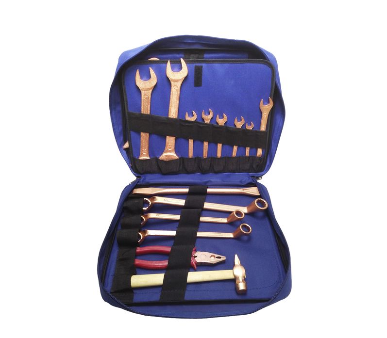 Скомплектован специально для использования во взрывоопасных зонах – магистральных трубопроводах, АЗС, нефтебазах и т.д. Каждый инструмент покрыт гальваническим медным слоем толщиной 30 мкм, который служит более чем надёжной защитой от образования искр при выполнении опасных производственных задач.