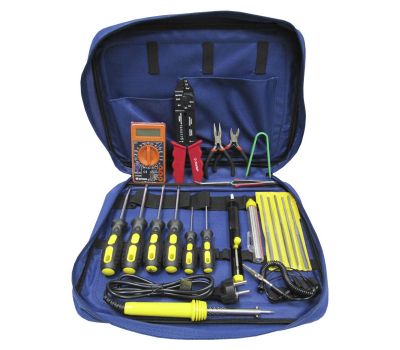 Набор инструментов электромонтажника (аналог ProsKit PK-2638B) предназначен для обслуживания и ремонта электроники и точной механики. Набор состоит из 13 предметов, в который входит: отсос для припоя, набор надфилей 5 шт., инструмент для извлечения микросхем, припой 25 гр., набор отверток 6 шт. (SL, РН), паяльник с долговечным жалом, антистатический браслет, стриппер многофункциональный 0,75х6мм2, мультиметр ДТ-832 (с прозвоном), длинногубцы, кусачки, пинцет изогнутый заостренный антимагнитный, сумка.