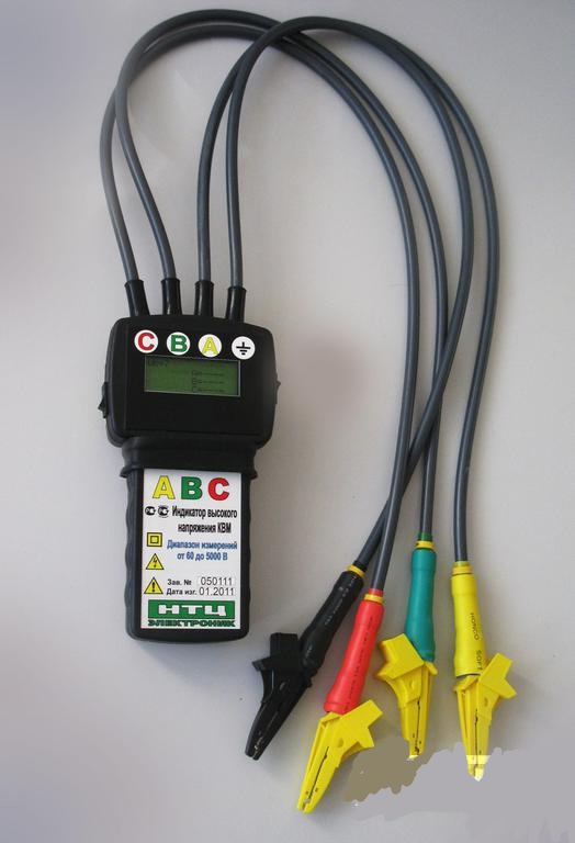 В состав индикатора КВМ входят высокоомный делитель, процессорный узел, индикатор и комплект силиконовых проводов с зажимами типа «Крокодил» для подключения к шинам 3-х фазной сети.