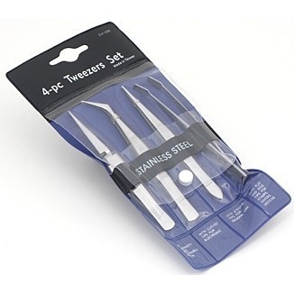 Набор из 4-х стальных пинцетов: с острыми концами; с самосжимающимися концами; с лопатками; с закруглёнными концами. Длина 4-3/4" (120 мм). Подходят для работы с мелкими деталями, ремонта печатных плат, вытаскивания деталей из труднодоступных мест. Удобный пластиковый чехол для хранения.