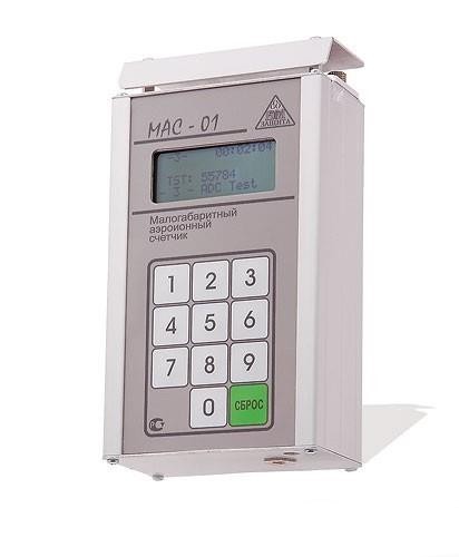 Конструктивно счетчик МАС-01 выполнен в виде малогабаритного переносного прибора с автономным питанием от аккумуляторной батареи (6 элементов типа GP 85 ААК). Основным узлом счетчика МАС-01 является аспирационная камера, сочлененная с вентилятором и предусилителем. Управление режимами работы, обработка информации и индикация результатов на цифровом табло осуществляется с помощью встроенного микропроцессора.