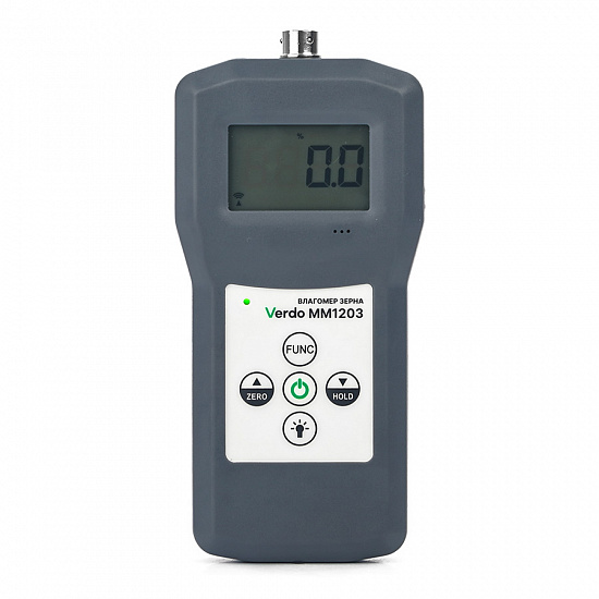 Влагомер зерновых культур VERDO MM1203 предназначен для измерения относительной влажности различных видов зерна (37 кодов) в процессе сбора, накопления, перевозки и хранения. В приборе реализован кондуктометрический метод измерения с автоматической температурной компенсацией. Также во влагомере предусмотрены функции калибровки (установки) нуля и корректировки показаний. Влагомер VERDO MM1203 имеет эргономичный корпус и оснащен большим ЖК-дисплеем с подсветкой для удобного считывания показаний, а также выносным щупом для удобства измерений. Питание влагомера осуществляется при помощи четырех батарей типа ААА.